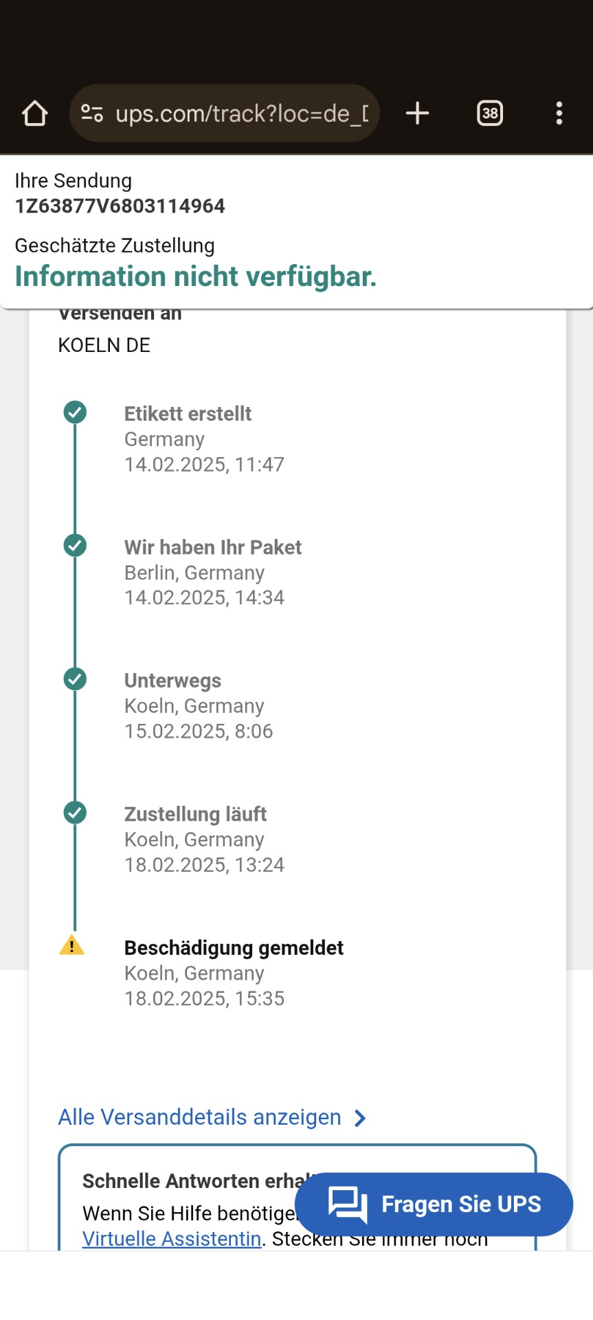 Ende vom Lied: Sendung ab heute Morgen irgendwann in Zustellung. Ziel: der Pickup Shop. Also kann ich beruhigt auf Dienstreise. Auf dem Weg zum Bahnhof sehe ich im RĂŒckspiegel, dass DPD vor meinem Haus hĂ€lt. Irritiert fahre ich zurĂŒck und siehe da: die Lieferung kam an. Nicht zum Pickup Point sondern zu mir, mit fettem Aufkleber, dass die Adresse unbekannt sei.