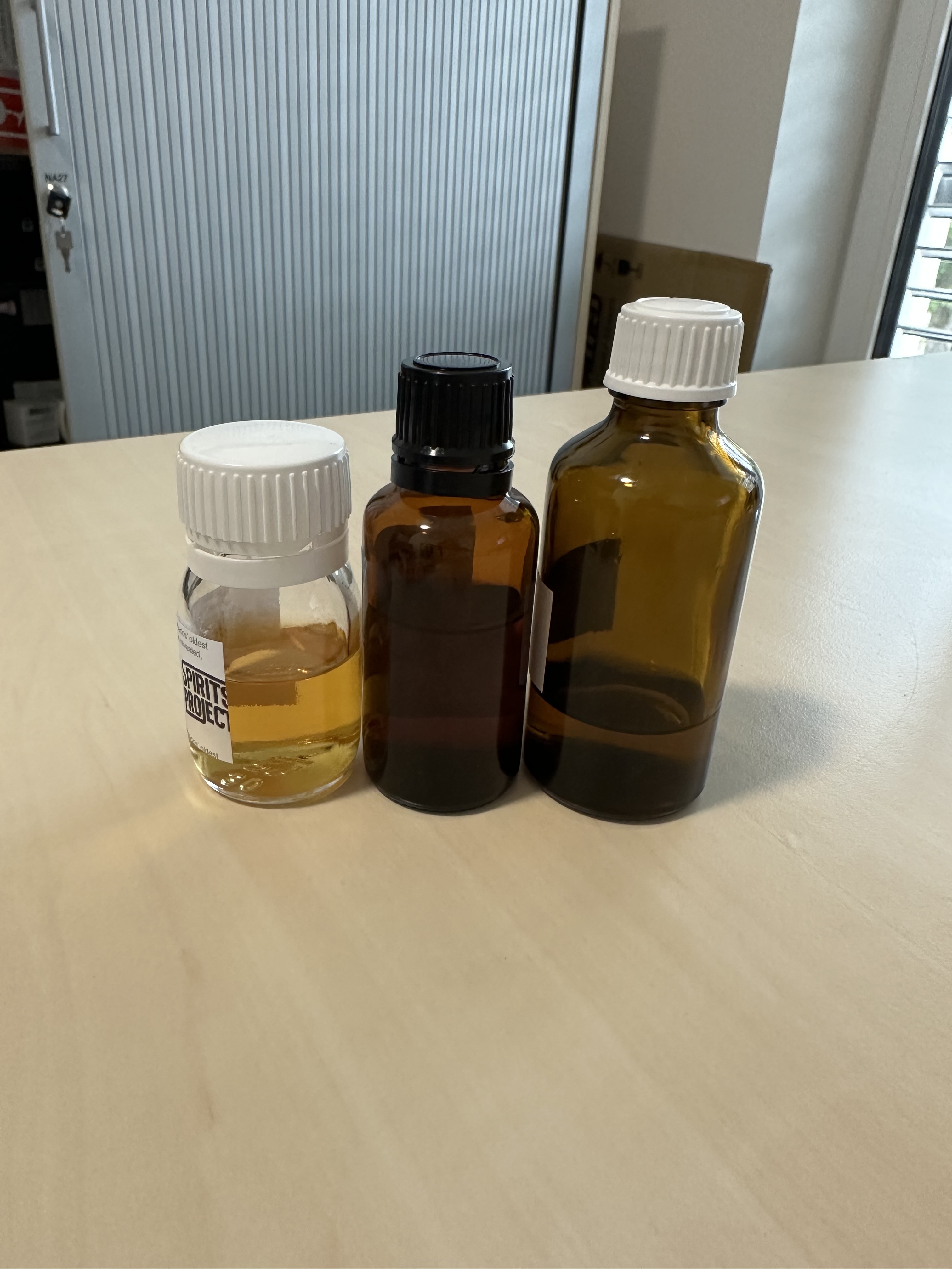 Die meisten Samples die ich in letzter Zeit erhalten habe sind in diesen braunen „Apothekerflaschen“ oder so kurzen & breiten mit ordentlichem Deckel (siehe Foto).